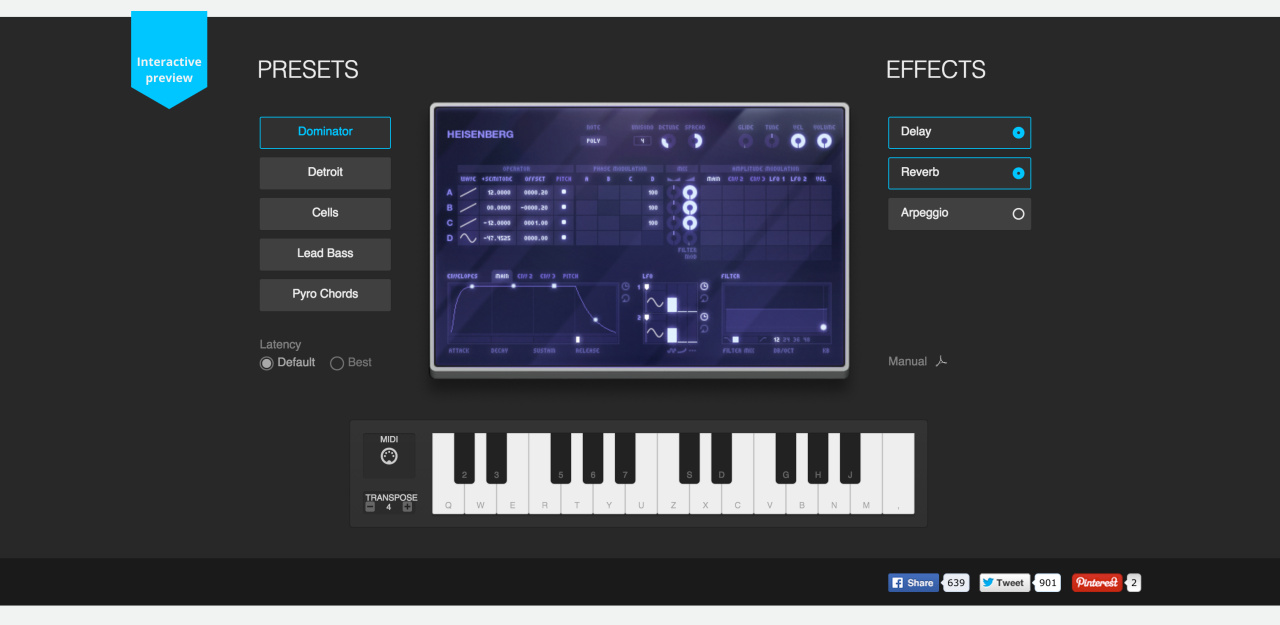 One of the most impressive example is Heisenberg, an HTML5 synthesizer that makes use of the WebAudio API and Chrome's built-in MIDI support. While it's more of a teaser than a fully featured synth at this point, Heisenberg does let you toy around with its five presets, changing the waveforms and envelope filters, as well as letting you add delay and reverb or arpeggiation. Heisenberg is made by the developer Audiotool, which also makes an impressive full-on internet-based DAW in Flash. The developer is working to move the DAW over to HTML5, but you can check out the Flash version for free in the interim.